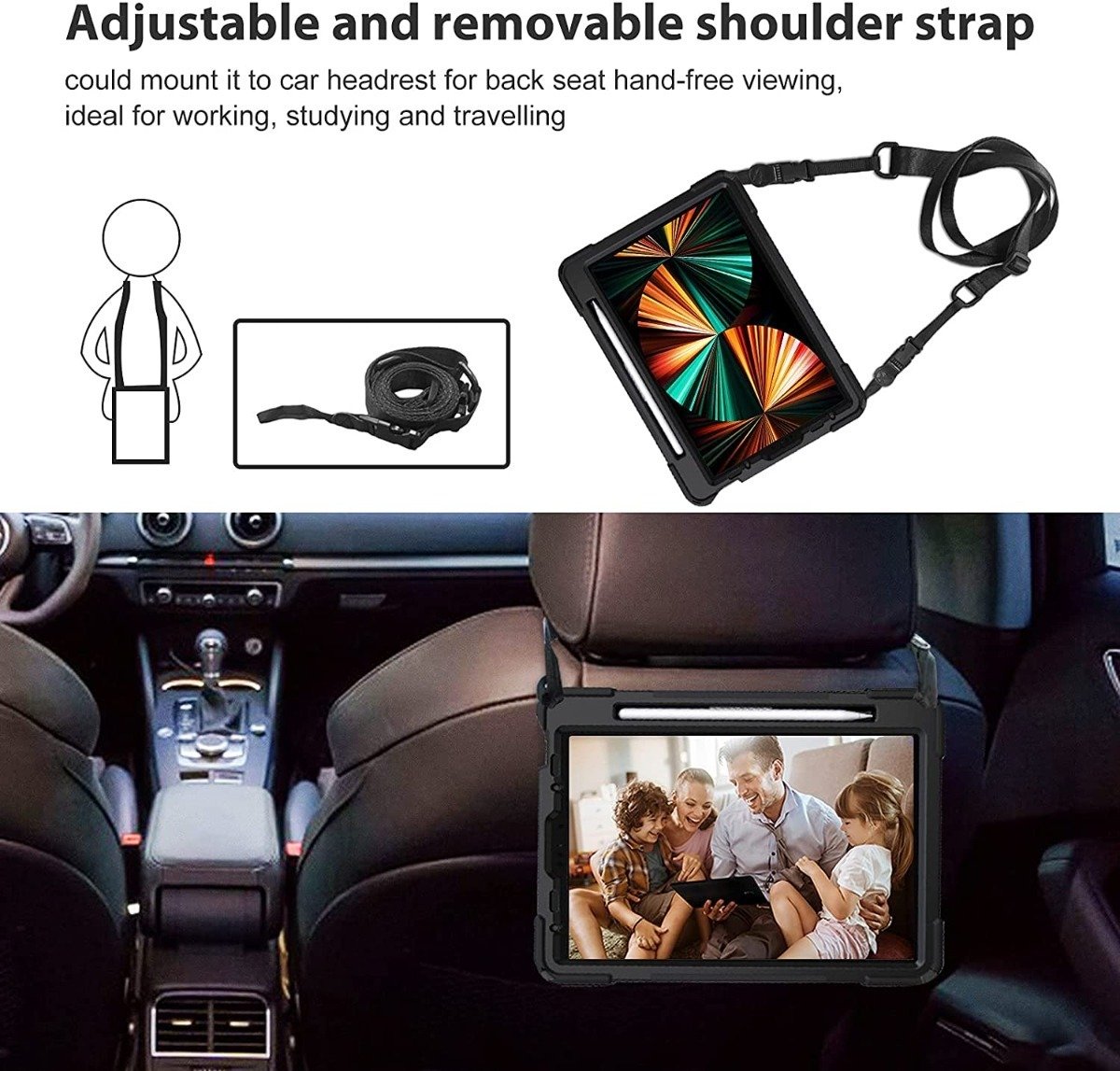 • Cinturón de hombro: otra característica que hace especial a esta excelente funda es la instalación opcional del cinturón de hombros ajustable. Este cinturón viene incluido junto a la funda y usted lo puede instalar o retirar dependiendo del uso o necesidad . La longitud del cinturón y su sistema de ajuste permite colgarse la tableta en su cuerpo en diagonal o sobre un hombro, incluso colgarla frente a los asientos traseros del automóvil para permitir el uso de la tableta a los pasajeros.